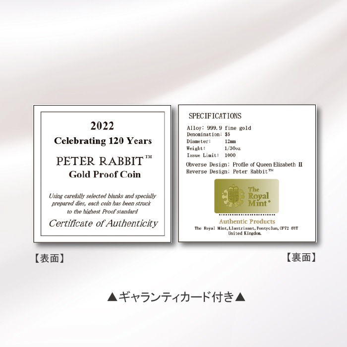 『ピーターラビットのおはなし』絵本出版120周年 2022年『ピーターラビット(TM)』 1/30オンス純金金貨ペンダントDX
