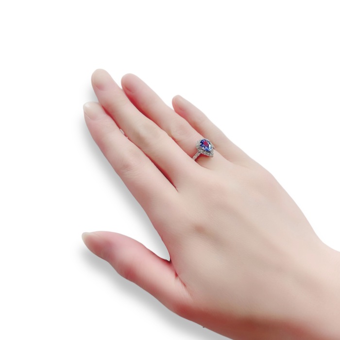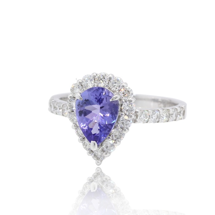 1ctの大粒タンザナイトの周りには14石のダイヤをセット、両脇にも5石づつ埋め込みトータル