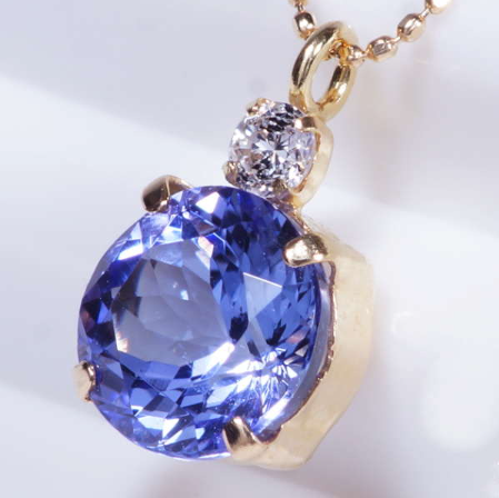 ●大粒1カラットアップのラウンドカットを施した良質タンザナイトを贅沢に使用。パープリシュブルーに輝くタンザナイトが胸元で美しく映えます。