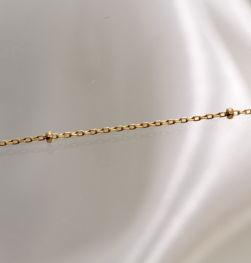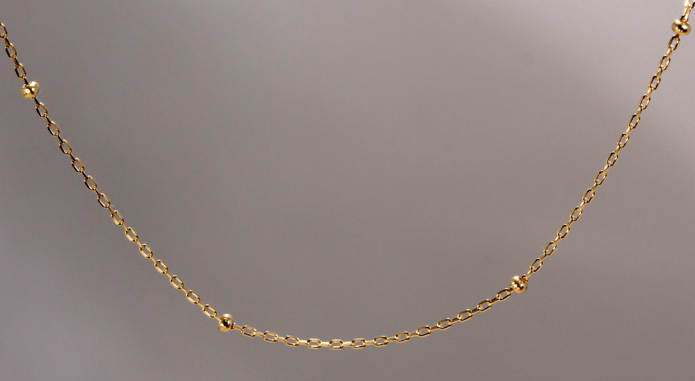 今回のネックレスは若い方から大人の方迄ピッタリのシンプルでお洒落なデザインに仕上げました。長さは少し長めの42cmと50cm。チェーンはアズキステーションタイプで一繊細なアズキチェーンをベースに楕円形のパーツが2㎝おきに留まっているステーションタイプ。