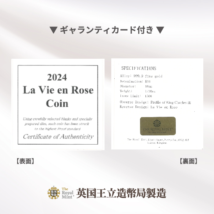 このバラと「La vie en rose」の文字がデザインされた2024年発行の純金金貨です。